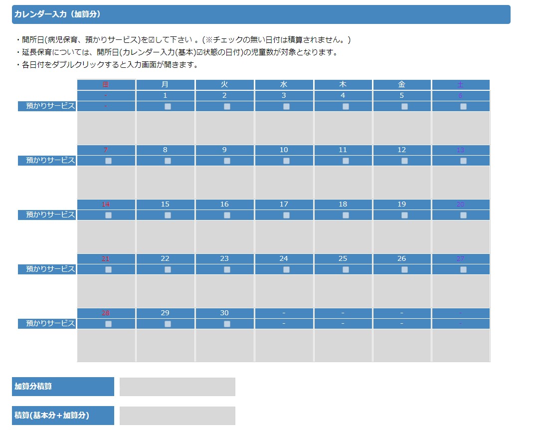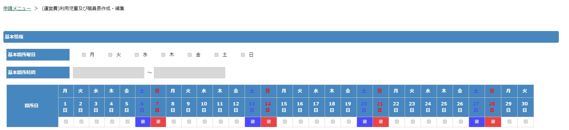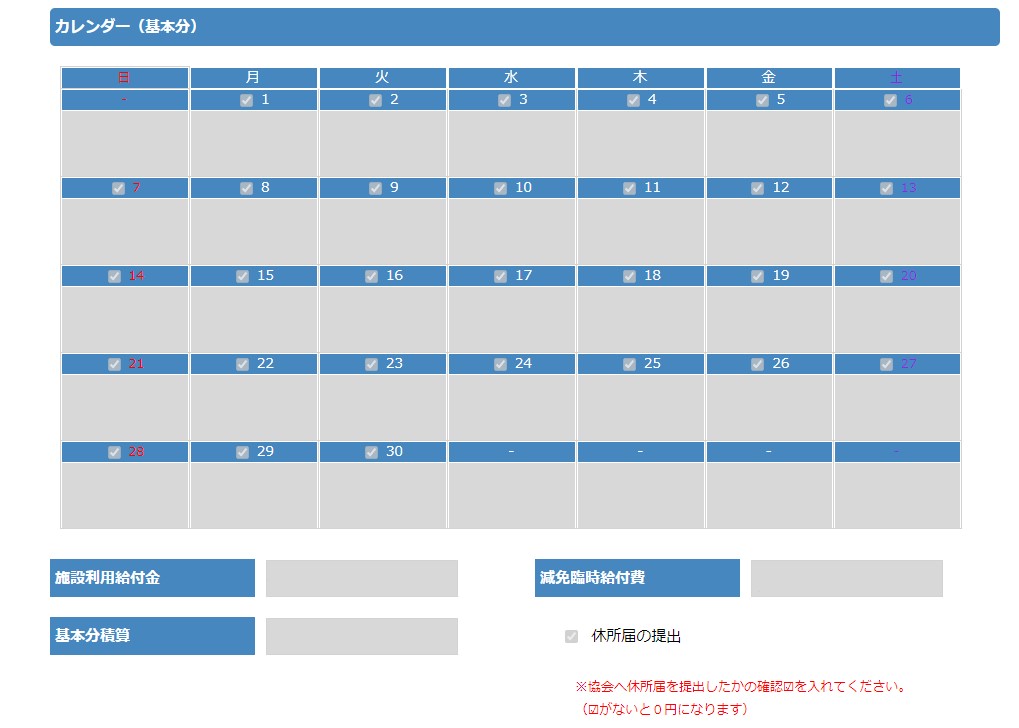 カレンダー入力(基本分)については、開所日にチェックを入れましょう。毎月、都度入力が必要です。