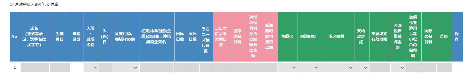 在籍している、もしくは在籍していた児童のうち月16日以上利用する契約であり、月の途中で入退所した児童を記入します。「月初日の在籍児童」で入力した内容に加えて、「入所退所の別」と「入(退)日」を入力します。