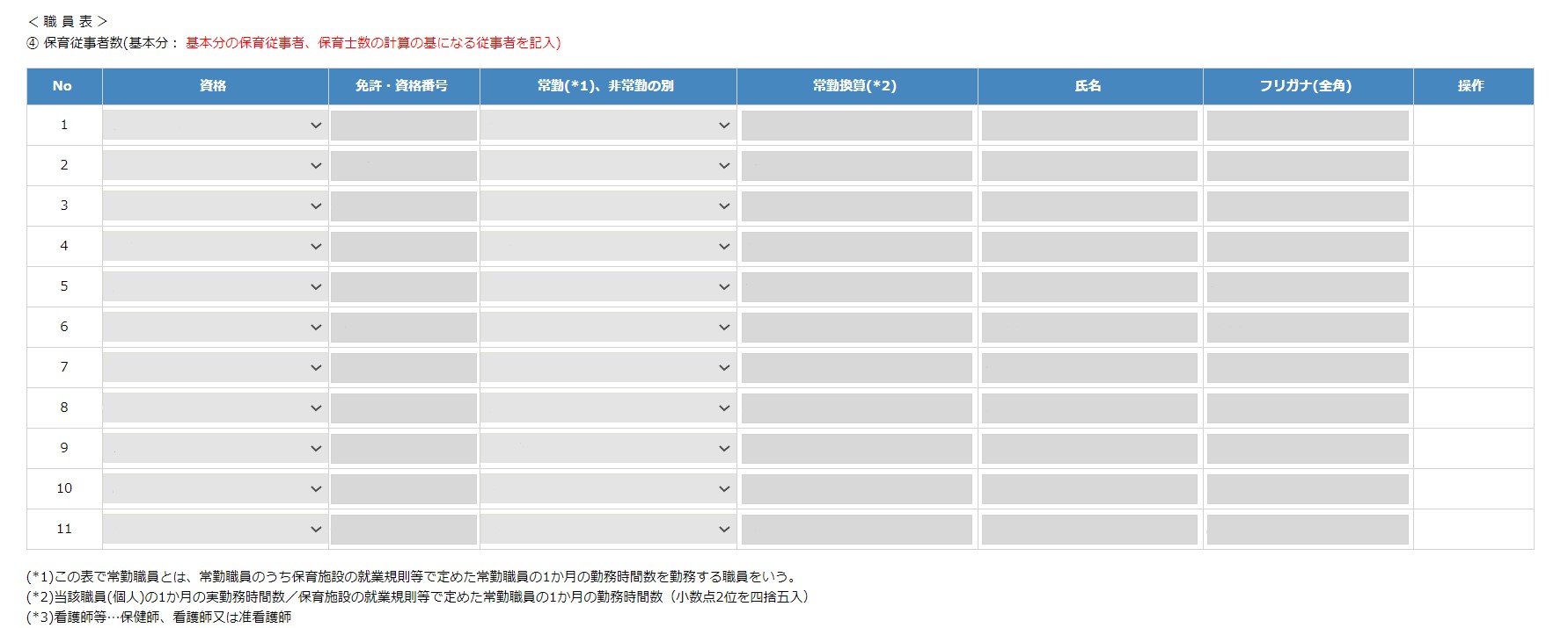 基本分に該当する保育従事者のみを記載します。注目するポイントは、以下の項目です。