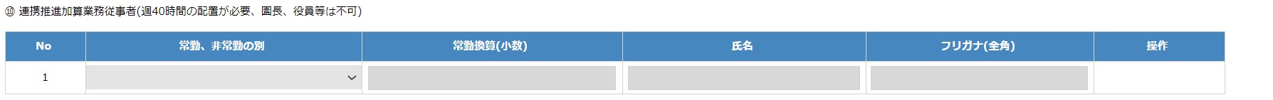 施設に勤務する連携推進職員(事務担当職員)を入力します。事務仕事がメインの事務員を雇用している場合は、連携推進加算業務従事者への記入が必要です。