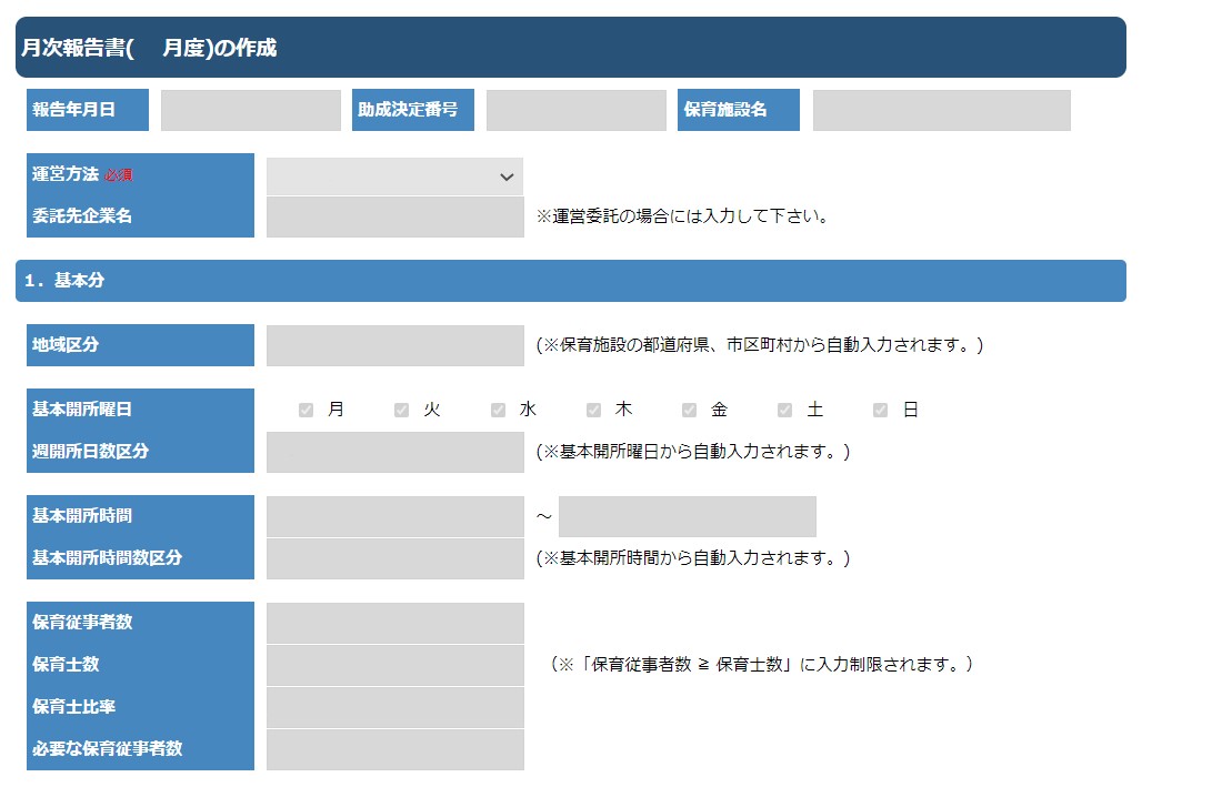 「月次報告書(○月度)の作成」については「助成決定番号」「保育施設名」「地域区分」は申請時と相違が無いように記入しましょう。